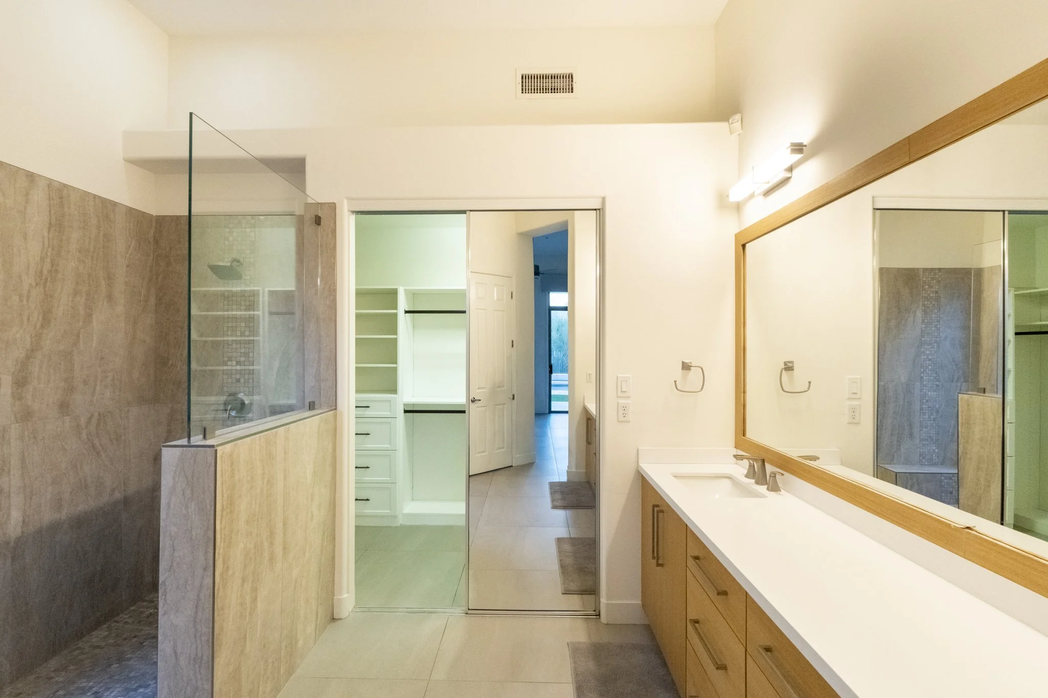 Large windows and a sliding door create an airy primary suite filled with the Arizona sun.