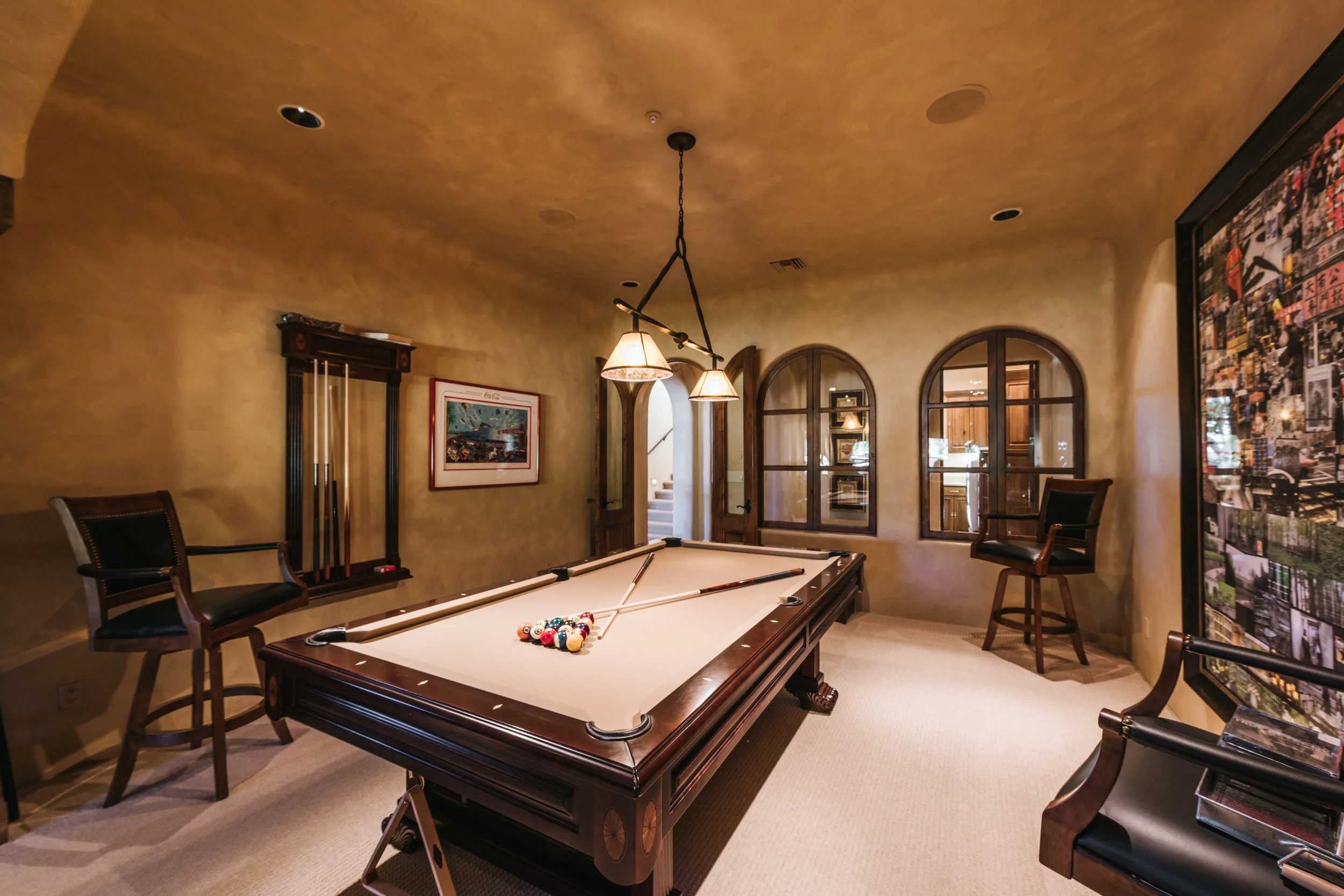Whether relaxing by the fire in the expansive living room, or lounging outside, summery-beverage in-hand, by the glittering pool, luxury remains the ever-present theme in this sprawling, 9,000+ square foot desert paradise. Envisioned, designed, and built by Gary Gietz, this elegant, 4.39-acre North Scottsdale property owns marquee amenities that cater to those with more discerning tastes—artisan wood finishes, Cantera flooring, both coffered and vaulted ceilings, hand-plastered walls, and—of course—signature views of Pinnacle Peak and Troon Mountain throughout. Slip outside with ease as all the rooms of the house connect to the inviting grounds. Outside, bask in the sounds of fluid motion as water cascades through the terraced fountain, or find harmony by gently strolling barefoot through the grassy lawn. Follow your feet as they eventually carry you to the capstone of the estate—a Moroccan-styled, detached guest house with a 2-car show garage clad in a racing-inspired hot-rod red.