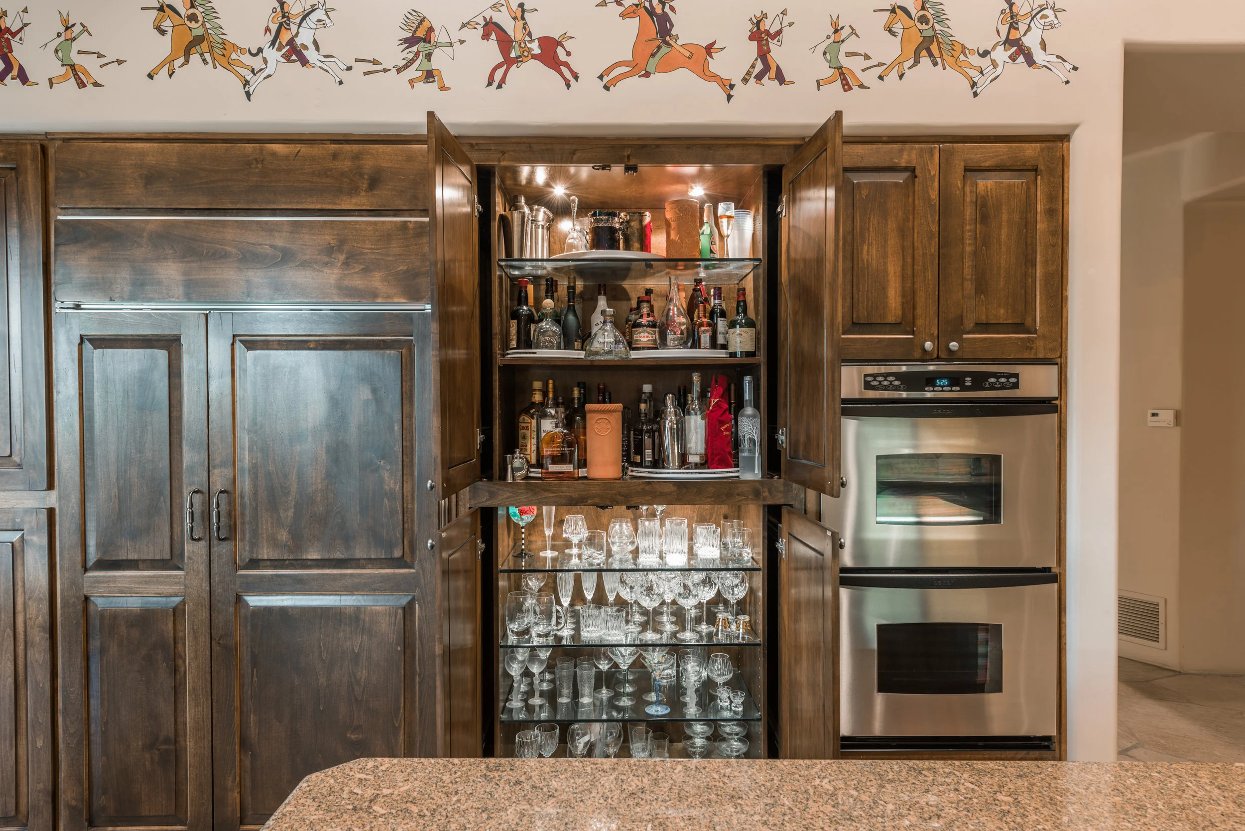 Efficient and convenient space is demonstrated here at 10040 Happy Valley home where display of a few decorative wine racks and a wine cooler will keep all your favorite labels under perfect temperature control and easily accessible.
